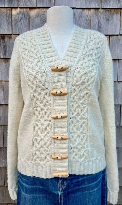 A V-neck cabled cardigan is a time-honored classic. This one balances a striking original cable with wide sections of stockinette for ease of knitting and ease of wear. The undyed merino wool is soft and strong and goes with everything. It features some lovely embellishments like a pretty cabled transition from ribbing to stockinette and a V design on the back to mirror the front. The cabled saddle shoulder adds some structure to a soft yarn, making for easy sizing as there is no hard seam to line up with the edge of your shoulder. This cardigan is worked flat, bottom up and has a set-in sleeve.